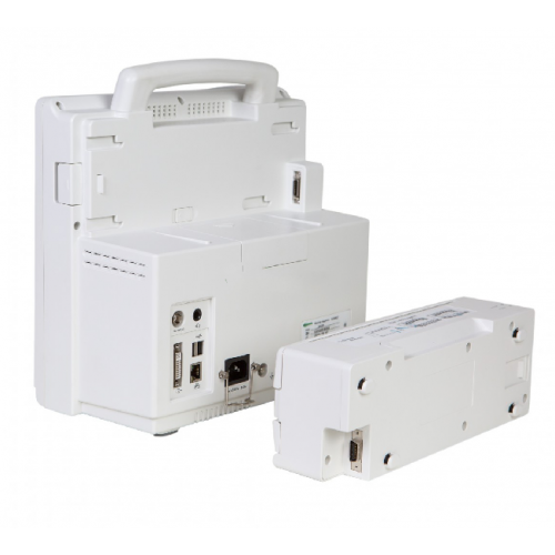 - Конструкцією монітора передбачено вбудований модуль основних параметрів (ЕКГ/RESP, SpO2, НІАТ, ТЕМП х2) два слоти для знімних модулів та слот для модульного 12-канального термопринтера.